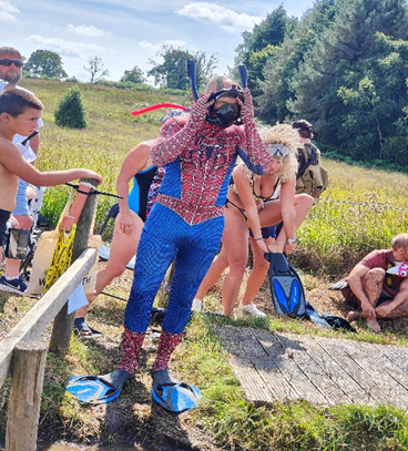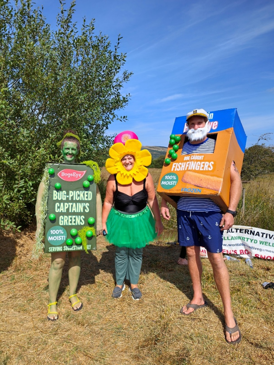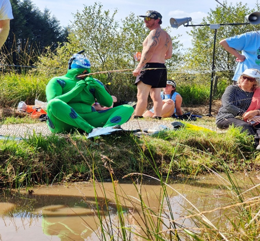 Throughout the day, a variety of creative costumes entered the bog. A giant frog sat cross-legged on the deck, while Spiderman made an appearance. The marshals joined in the fun, playing the Jaws theme for a competitor with an inflatable shark and the wedding march for a newlywed couple racing together as part of their wedding celebration. The sight of a white wedding dress emerging from the bog, stained brown as a builder’s tea, drew gasps from the crowd.