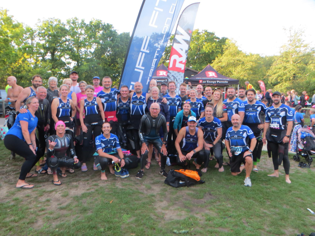 As usual it was a very well-organised event and after a changeable weather forecast earlier in the week, the weather played ball.  Last year’s enforced trial of starting in 3 waves (caused by the threat of lightening!) proved so successful that the same format was used this year.  I (Kate Cooper) was in a team with Sam Mahé and Carey Woods, a late but very welcome replacement for an injured team member.  Carey was even more welcome, as she was happy to be the one in the mass start.  Carey had her trademark strong swim and I cheered her out of the water before heading into the lake for wave 2.  The weed had been cut and I barely noticed it compared to last year.  Sighting was tricky in the 2nd half as the sun was in my eyes, but overall I enjoyed the swim with the exception of an elbow in the nose!  After my usual slow transition, I was out on the bike seeing Clare Worgan disappear into the distance!  The bike course doesn’t really play to my minimal strengths and I was short of bike miles, but it is an enjoyable and well-marshalled route.  The run is my favourite discipline and I do really like that loop around the lake so finished on a high picking off a number of women on my way (although you never know if you are really beating them!).  The Tuff support was incredible, the only trouble that Mark Sole could be heard so far away that we all kept thinking we were nearer the finish than we were!  All in all, a great morning of Tufness and friendly competition – thanks everyone, especially Sam and Carey!