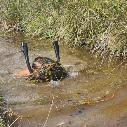 The water is neck deep and cold, but not uncomfortable. Quite refreshing in fact. While the tri-suit seemed to offer the best level of protection from leeches and slime, is was also the bog-snorkelling equivalent of power dressing: I felt a right plum hopping into a muddy ditch in a swank tri suit and then launching into a majestically average doggy paddle straight after a woman dressed as a puddle duck!